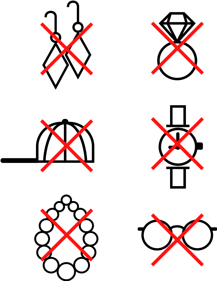- ピアス、ネックレス、指輪、ブレスレット、時計、固いツバ付き帽子などの装飾品は全て外してからご来場ください。